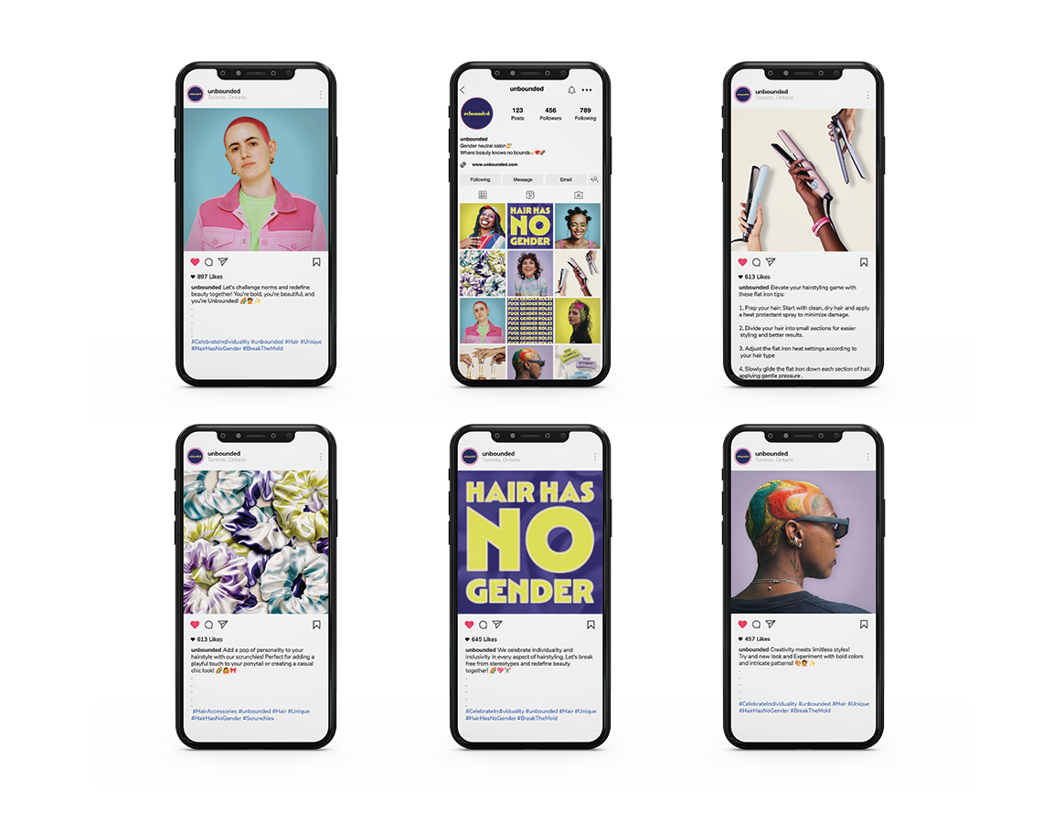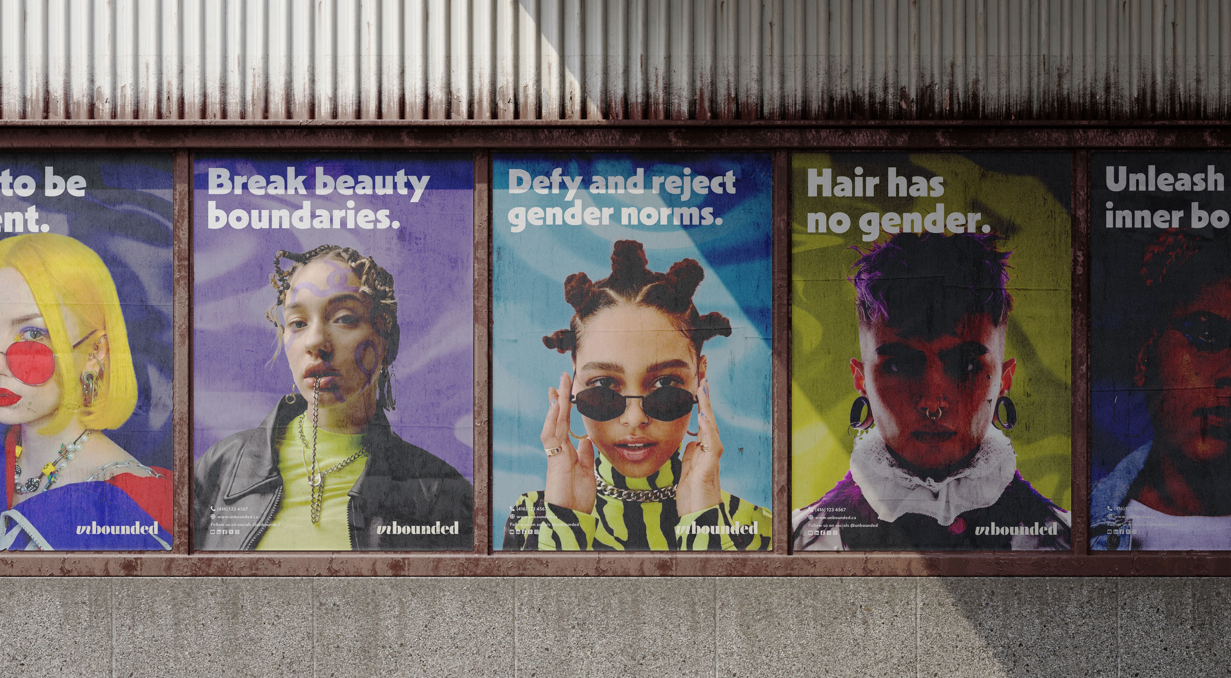 Unbounded is a non-binary hair salon that redefines the conventional beauty standards, where creativity flourishes and individuality is celebrated. Unbounded aims to be a trailblazer in the beauty industry, fostering confidence and authenticity through unique branding, and social media posts.
